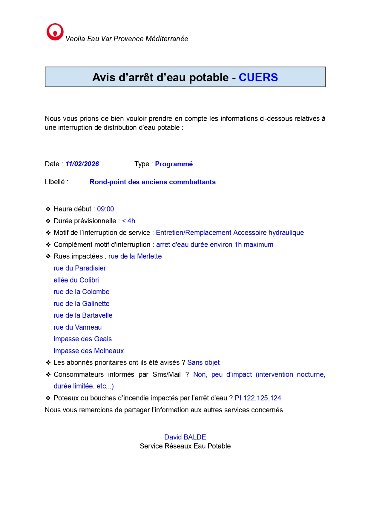 La société Veolia Eau Var Provence Méditerranée informe les habitants de la commune de Cuers qu’une interruption temporaire de la distribution d’eau potable est programmée le mardi 11 février 2026, dans le cadre de travaux de maintenance sur le réseau.