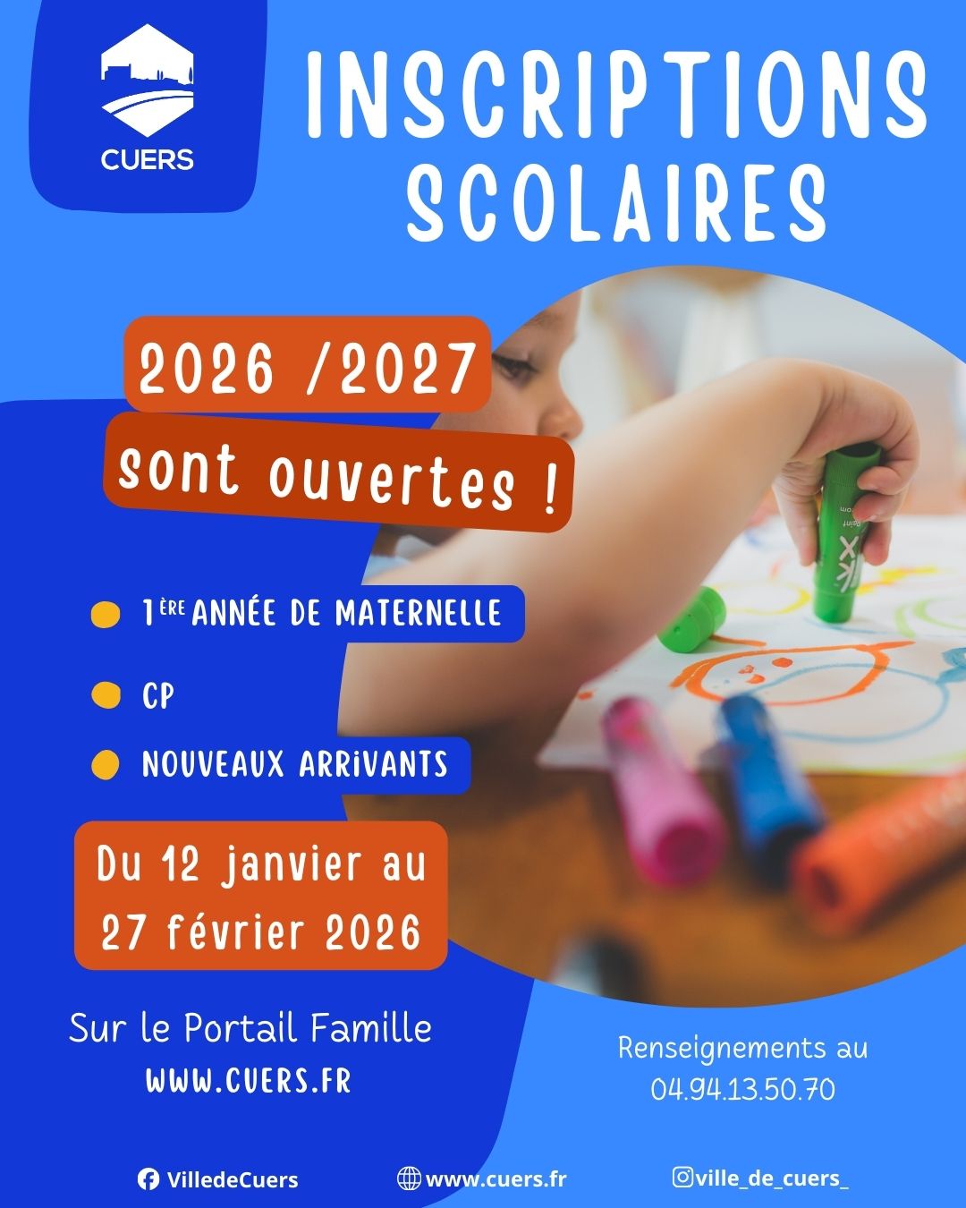 La municipalité vous informe que les inscriptions pour la rentrée scolaire 2026-2027 auront lieu du lundi 12 janvier au vendredi 27 février 2026 en vous connectant sur le portail famille de ville https://www.espace-citoyens.net/cuers/espace-citoyens/ .
