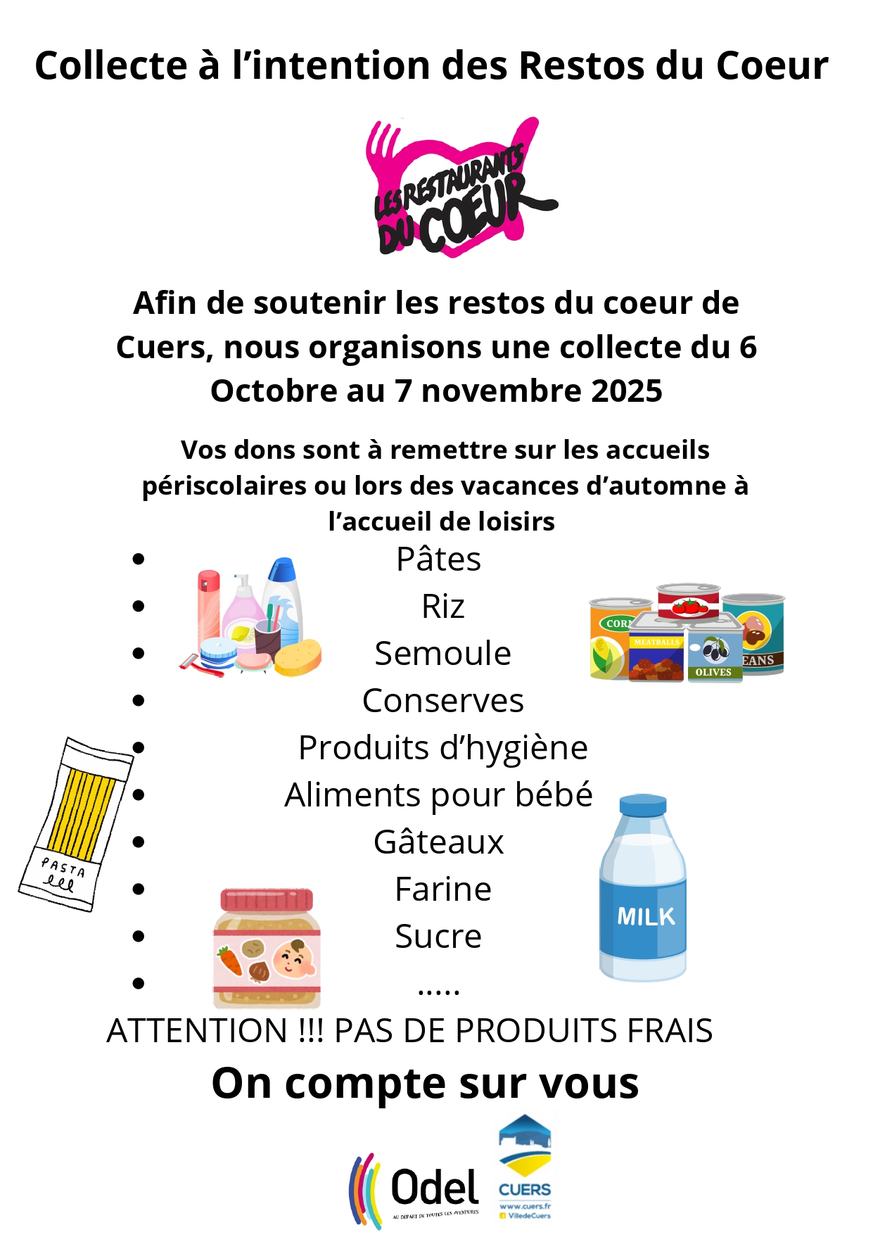 Jusqu’au 7 novembre 2025, les jeunes Cuersois se mobilisent pour remplir les paniers du cœur avec des produits essentiels. Les dons peuvent être déposés dans les accueils périscolaires ou à l’accueil de loisirs pendant les vacances d’automne.