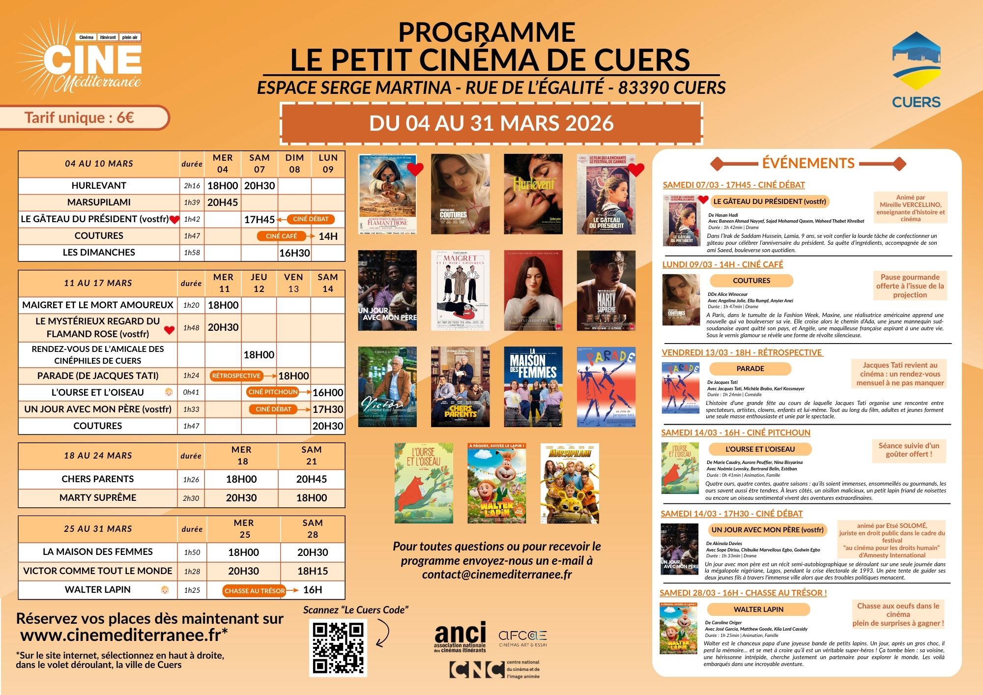 Réservez vos places sur le site internet www.cinemediterranee.fr : tarif unique de 6 euros.