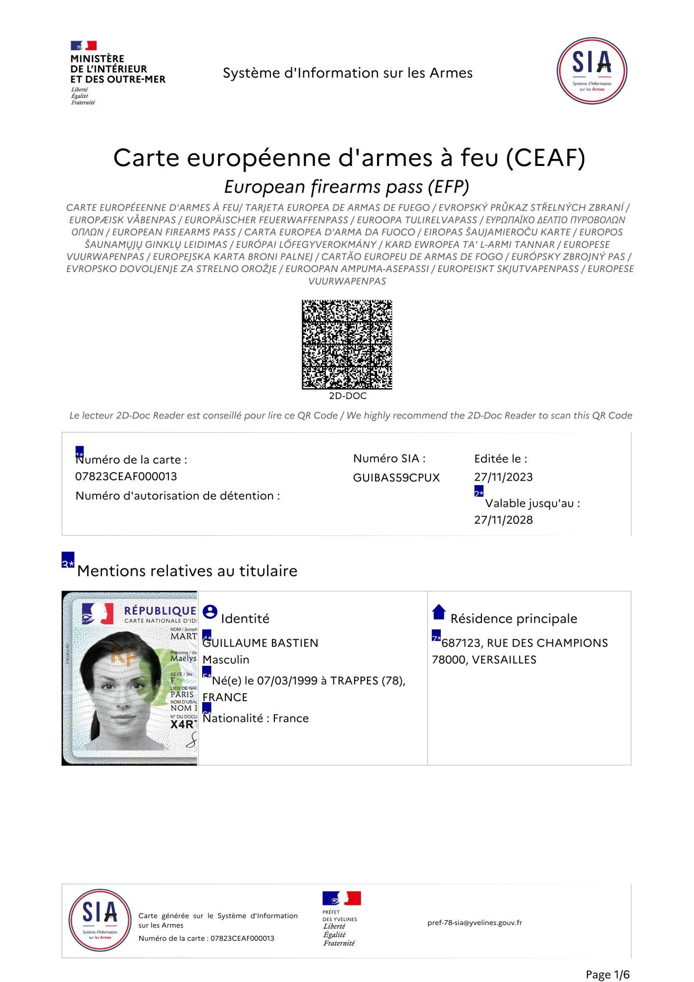 Carte européenne d’armes à feu mentionnant la ou les armes détenues